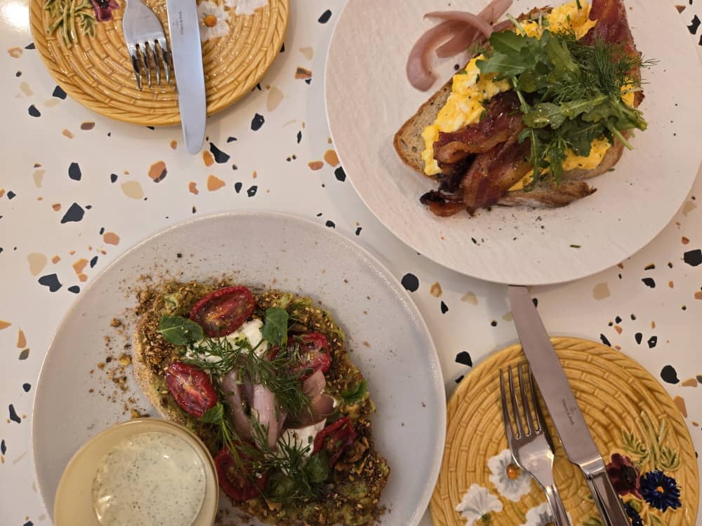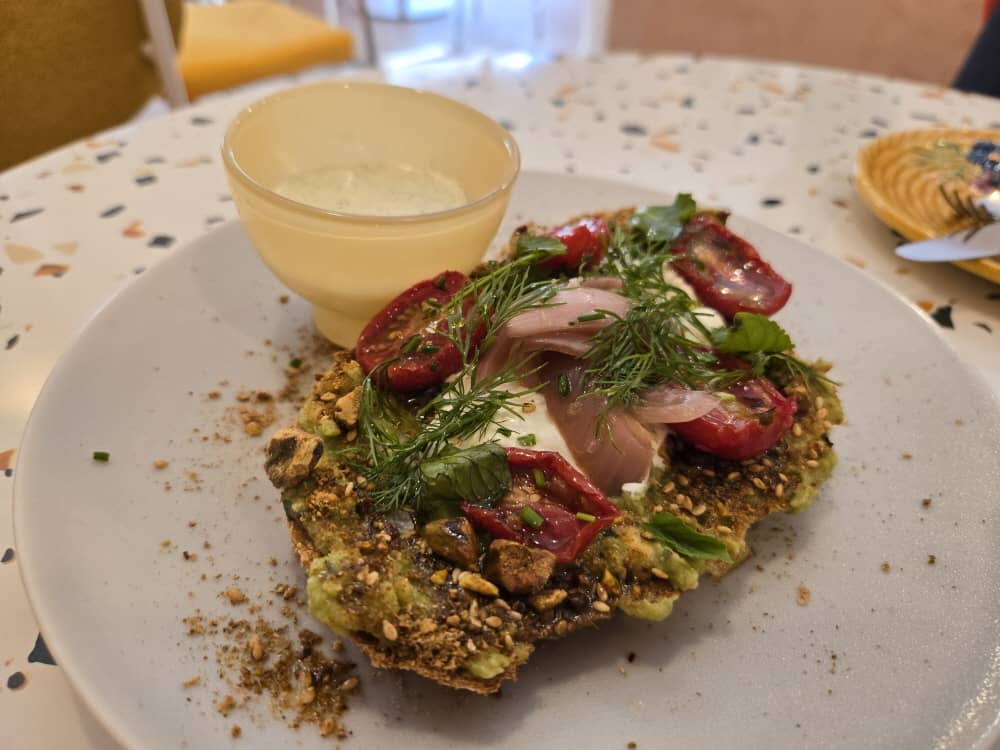 아보카도 토스트는 으깬 아보카도 위에 선드라이 토마토, 치즈, 피스타치오가 토핑 되어 있고 허브크림이 함께 나옵니다.