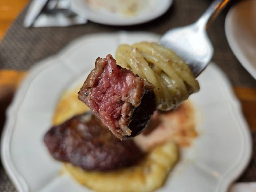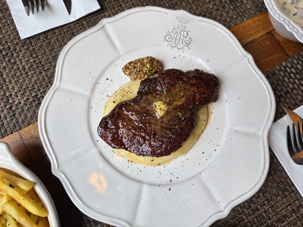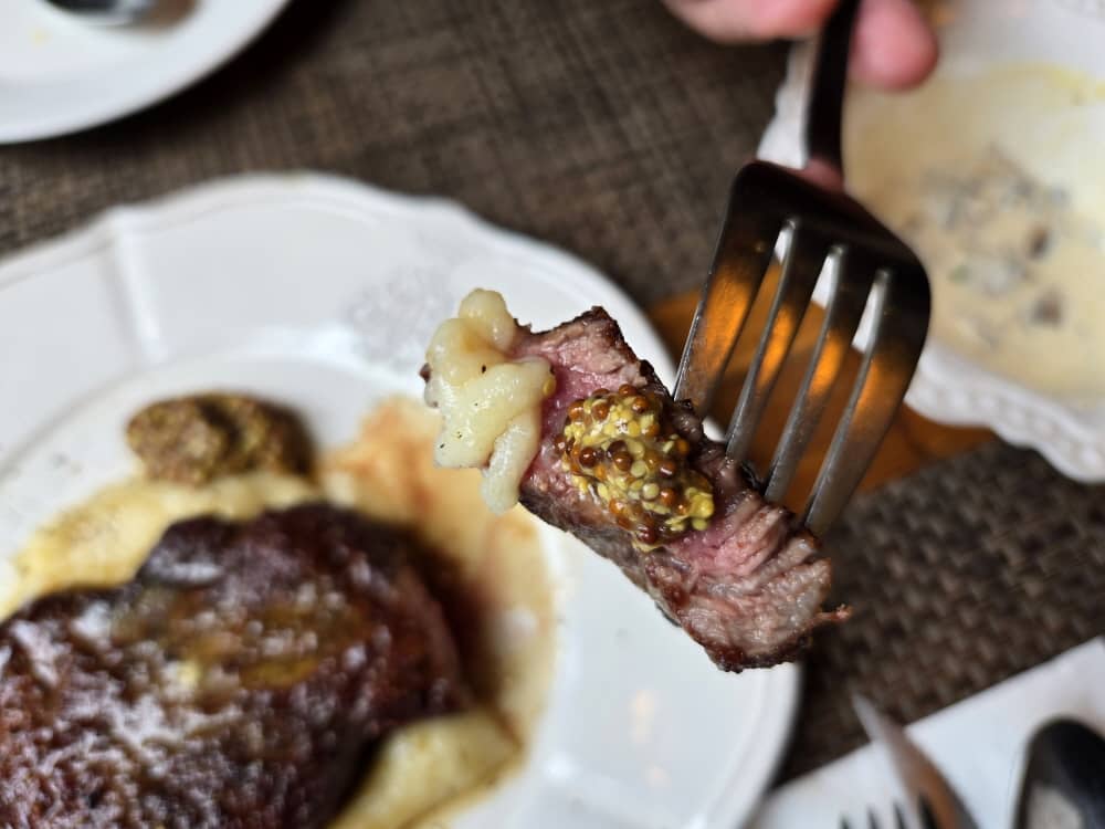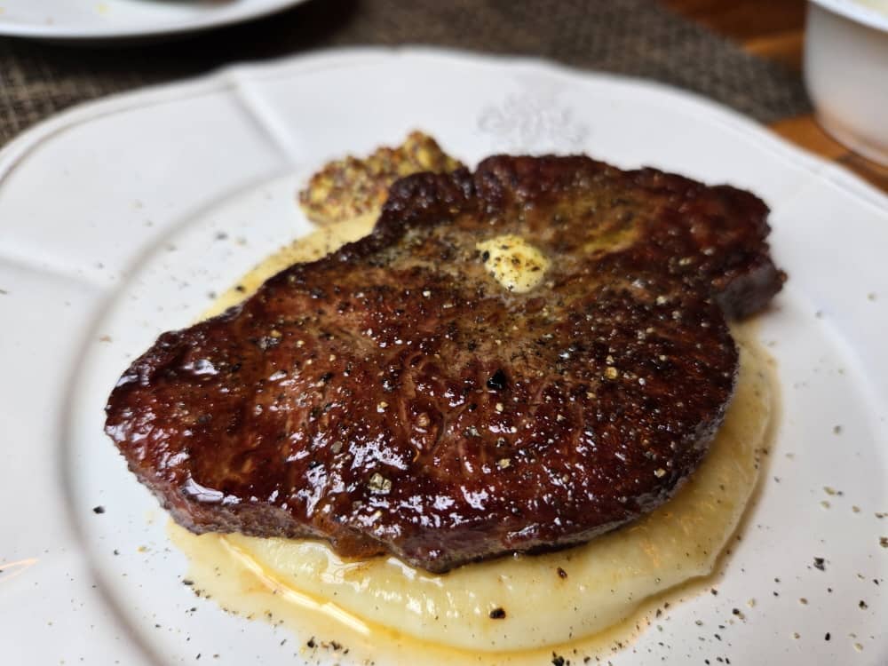 그리고 채끝스테이크는 위에는 버터조각이 올려져 있고, 밑에는 매쉬드포테이토와 치즈가 곁들여져 스테이크와 함께 곁들여먹으면 정말 맛있습니다.