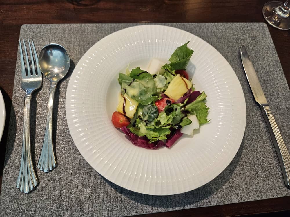 딸기, 파인애플, 참외가 곁들여진 상큼한 샐러드가 신선하고 맛있었어요.