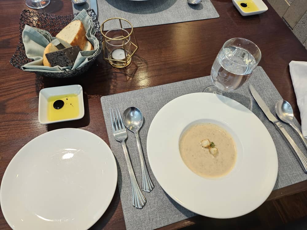 방금 구워 따끈한 빵은 당연히 맛있었고, 양송이 스프가 정말 맛있었어요.