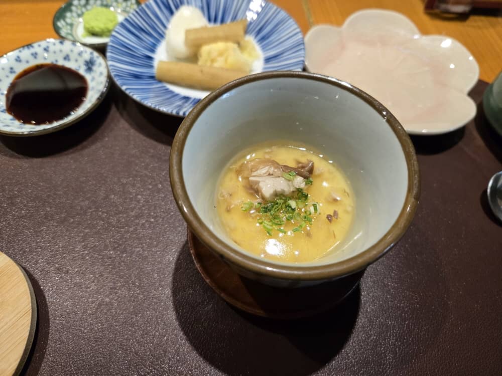 부드러운 계란찜 위에 버섯이 올라가있어요.