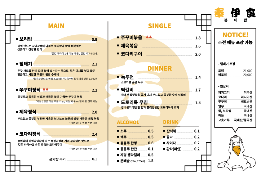 송도 봉이밥 메뉴