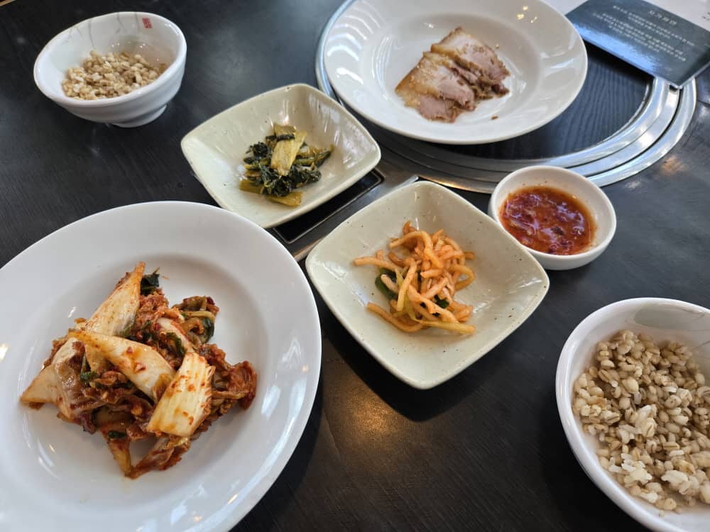 메뉴를 주문한 후 밑반찬과 보리밥, 수육이 나왔습니다.