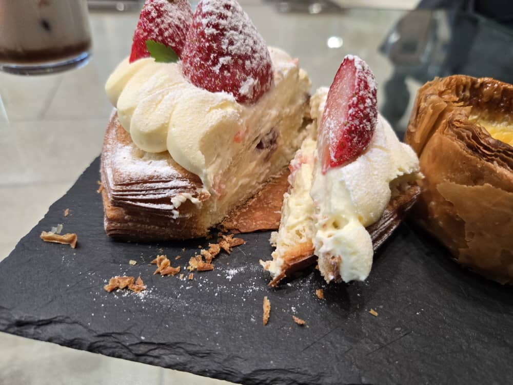 딸기와 함께 한입 가득 먹으니 딸기는 달콤하고 바닐라향이 나는 커스터드 크림에 패스츄리의 파사삭 식감이 어울어지며 정말 맛있어서 감탄이 절로 나왔어요.