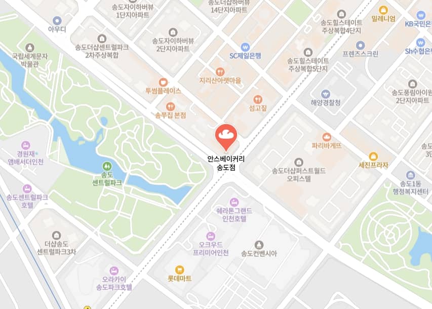 안스베이커리 송도점은 센트럴파크 바로 맞은편 큰도로변에 있어 찾기 쉽습니다.