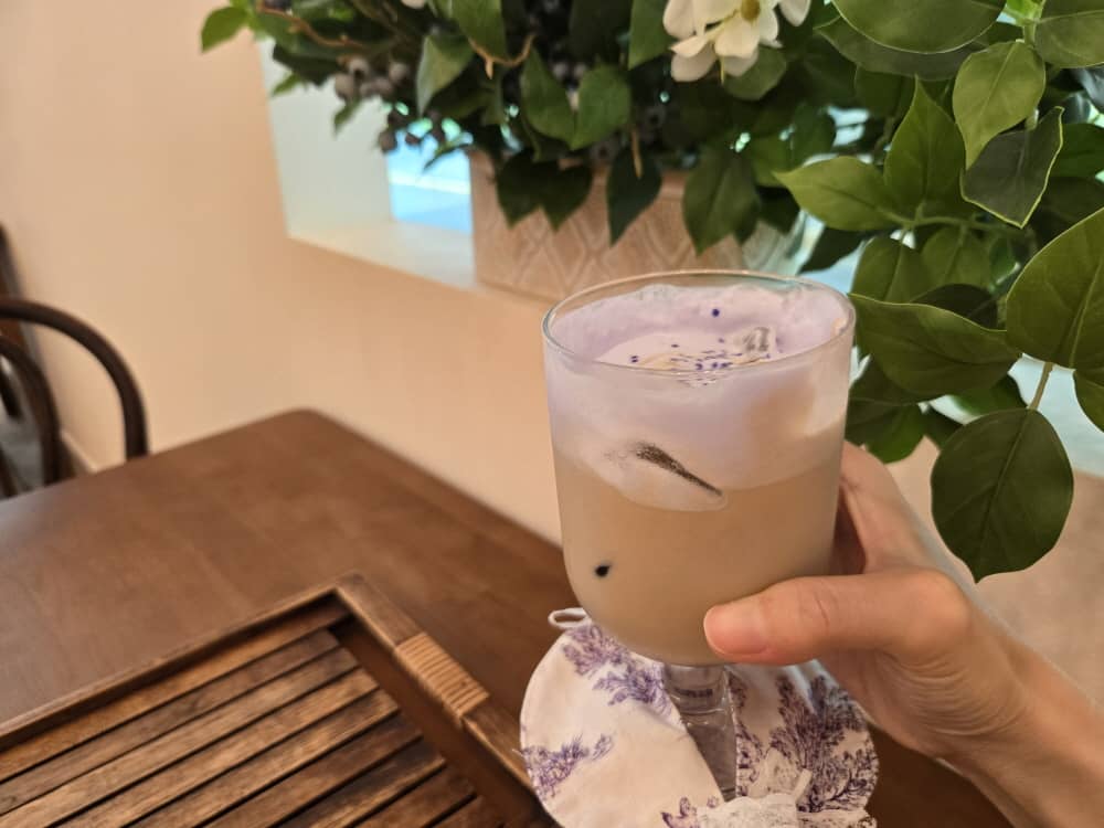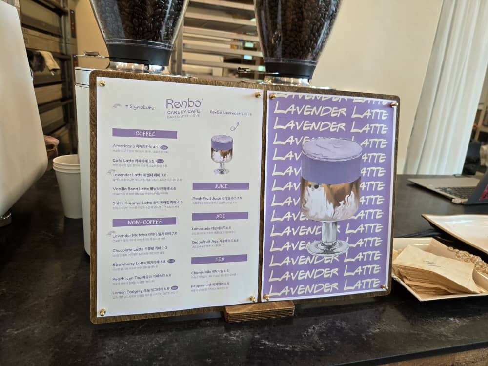 시그니처 라떼인 렌보라떼는 라벤더 크림이 토핑된 라떼에요.