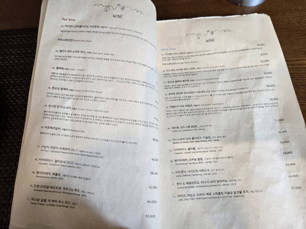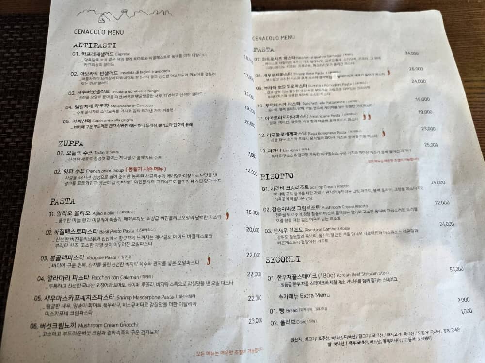 메뉴는 에피타이저부터 파스타, 리조또, 스테이크 등 있습니다.